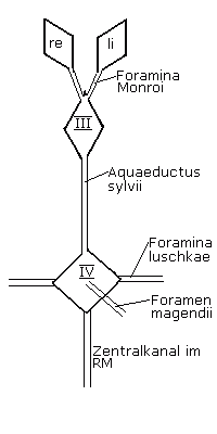 Vom Hauptbildungsort des Plexus chorroideus der Seitenventrikel gelangt der Liquor über das Foramen Monroi in den III Ventrikel und von dort über das Aquädukt in den IV. Ventrikel. Hier und am Dach des III. Ventrikels finden sich weitere Plexi chorroidei. Der Liquor erreicht dann über die Foramina magendii und luschkae die spinalen und intrakraniellen Subarachnoidalräume, von wo aus er zu den Resorptionsstellen, den